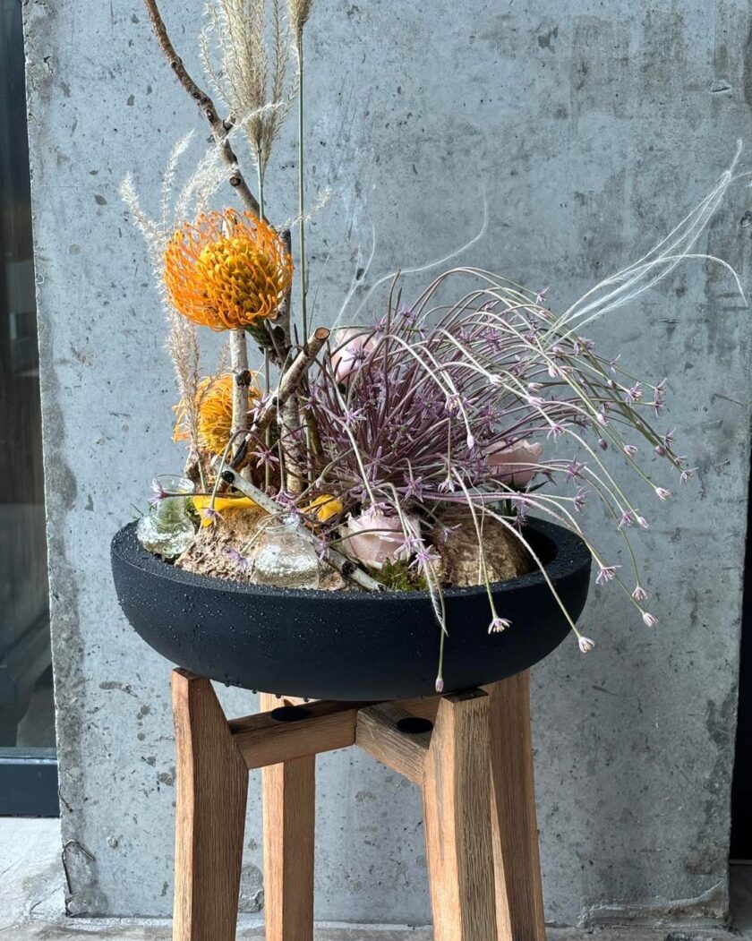 Aranjament floral conceptual cu protea, nisip, sticlă și ramuri uscate. O lucrare experimentală, cu estetică post-naturală, perfectă pentru spații de galerie, evenimente edgy sau recepții.
