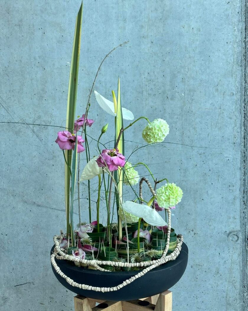 Instalație florală modernă cu forme grafice, anthurium alb și lisianthus roz. O piesă artistică pentru evenimente contemporane, recepții sau spații atipice.