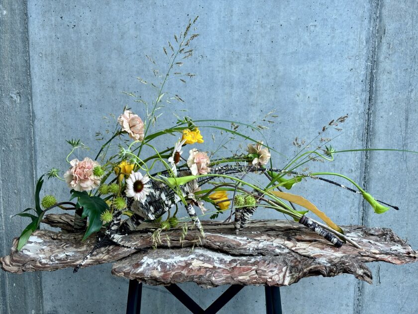 Compoziție florală orizontală, cu accente naturale și structură organică și din sârmă. Potrivită pentru spații de galerie,decoruri de eveniment cu tematică artistică, recepții, restaurante sau pur și simplu pentru casă.