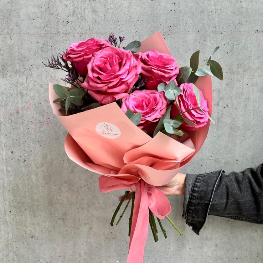 Buchet simplu și elegant cu trandafiri roz, limonium și eucalipt. Ideal pentru un cadou clasic cu o notă contemporană și delicată. Acest buchet este realizat din 5 fire de flori și verdeață decorativă.