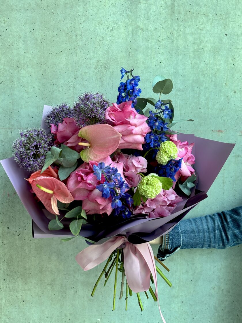 Buchet vibrant cu flori în nuanțe de roz, albastru și verde lime. Îndrăzneț, plin de contrast, creat pentru personalități vii și evenimente moderne. Acest buchet conține 19 fire de flori.