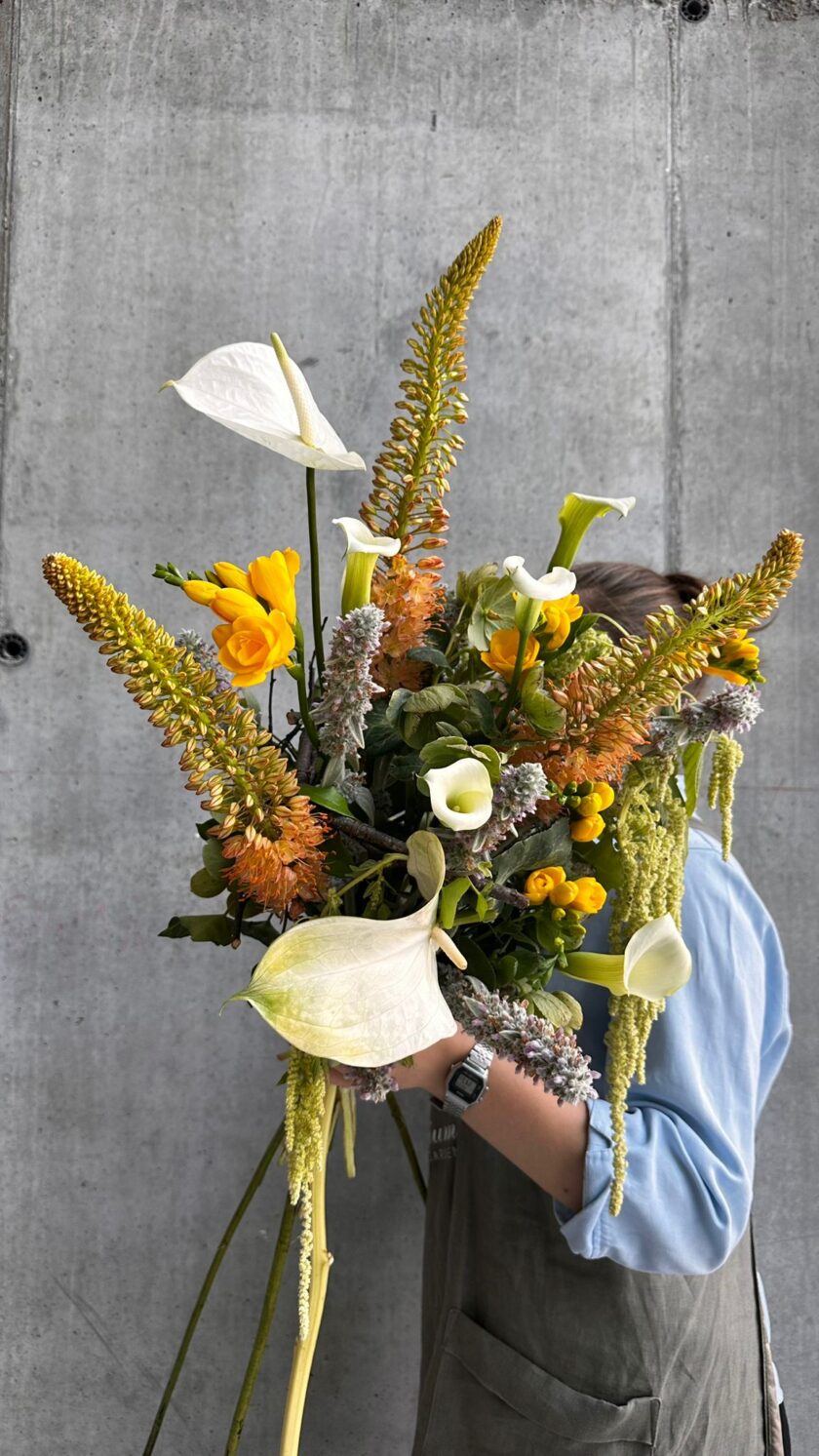 Un buchet de flori contemporan, alcătuit din 23 de fire, ce combină perfect tonurile calde de alb, galben și portocaliu, îmbogățit cu forme sculpturale. Designul minimalist, dar vibrant, aduce un plus de stil și rafinament oricărui spațiu, fiind alegerea ideală pentru cei care apreciază eleganța modernă cu accente naturale.
