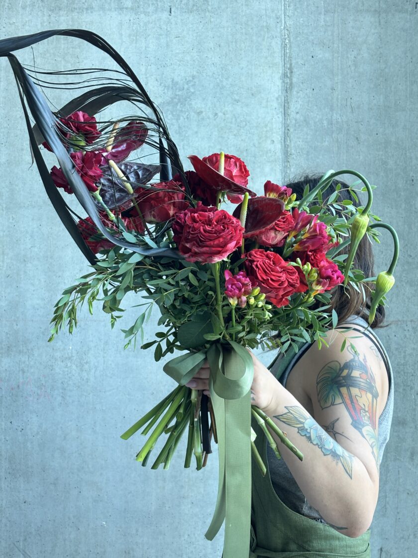 Buchet floral roșu cu trandafiri, anthurium și frunze negre dramatice. O alegere sofisticată pentru iubitorii de flori cu personalitate puternică. Acest buchet conține 19 fire de flori.