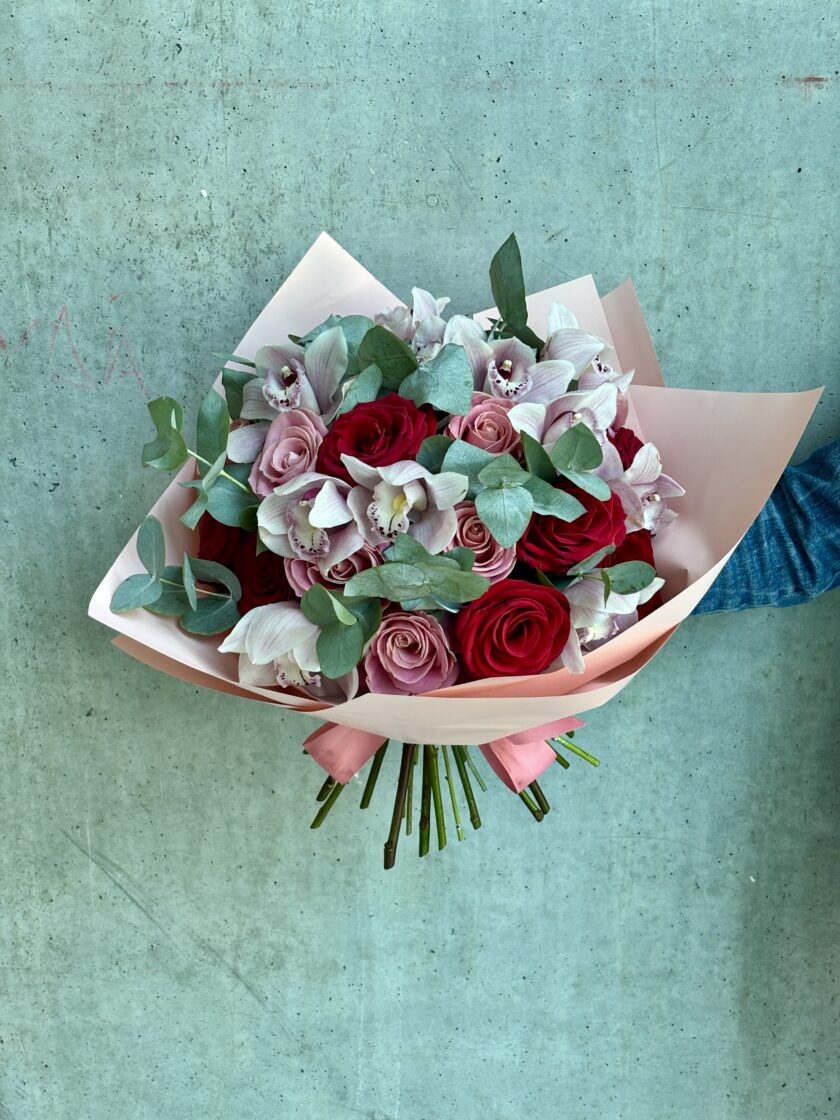 Un buchet elegant cu trandafiri roșii și roz și cymbidium, creat din 29 fire de flori. Delicat, dar expresiv.