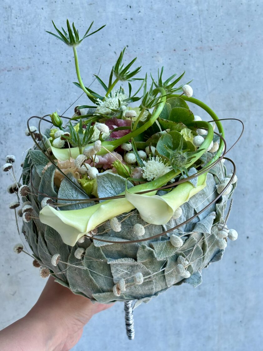 Buchet conceptual cu frunze texturate, craspedia și calla. O creație care evocă ritmurile lente ale adâncului marin, perfectă pentru o nuntă neconvențională sau pur și simplu de oferit.
