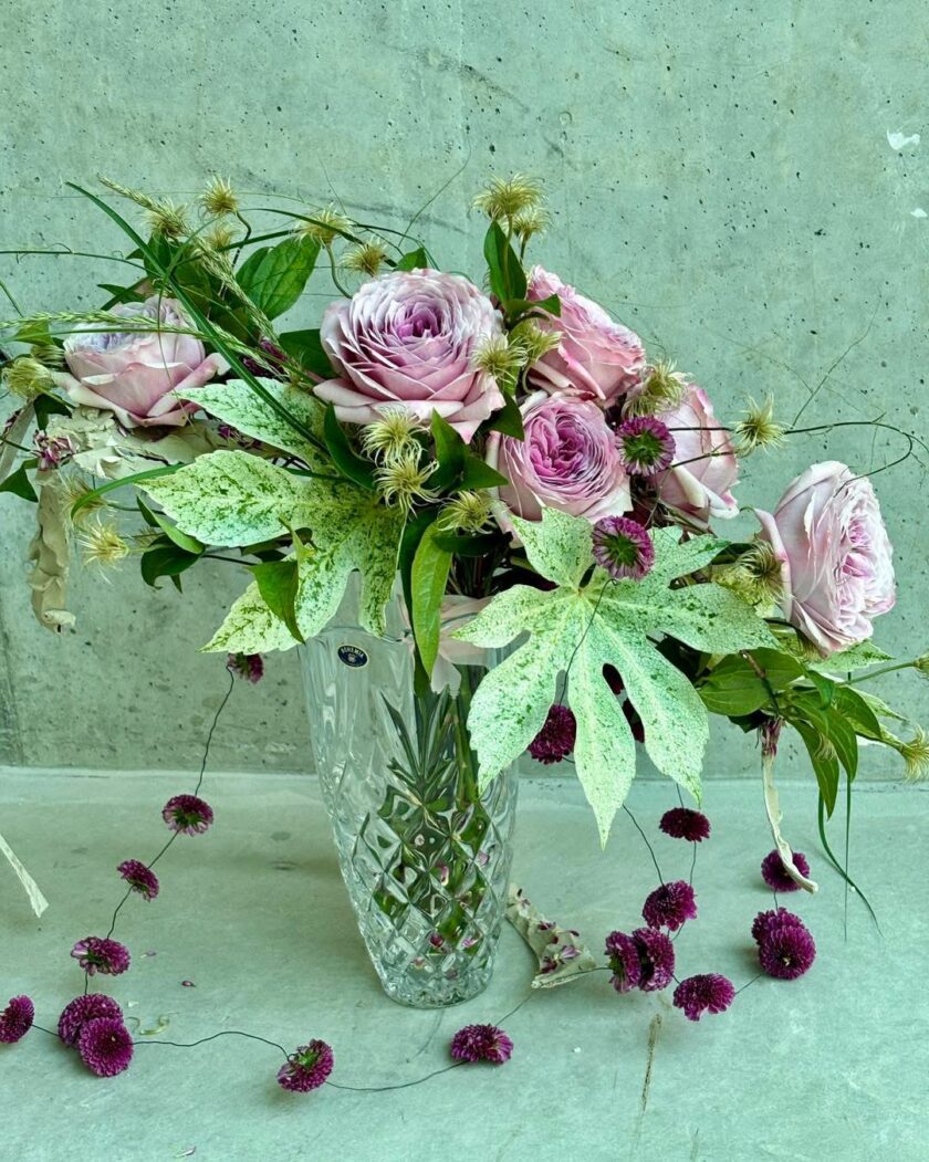 Buchet realizat pe o structură de sârmă, cu trandafiri de grădină și ghirlande de flori, perfect pentru cadouri de neuitat. Vaza nu este inclusă.