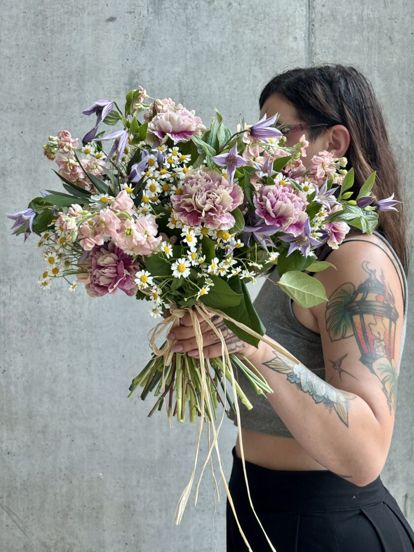 Buchet vesel și lejer cu margarete, clematis, garoafe duble și flori de sezon – un mix fermecător de texturi și culori pastelate cu accente mov și roz pudrat.