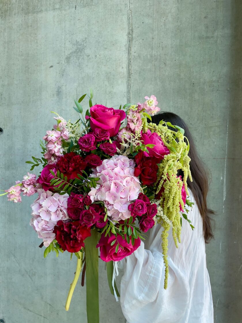 Un buchet de flori impresionant, compus din 19 fire de trandafiri și hortensii în nuanțe profunde de roz și roșu, ce radiază pasiune și eleganță. Combinația voluminoasă și bogată a florilor creează un impact vizual puternic, perfect pentru a celebra momente speciale cu un gest plin de rafinament și romantism.