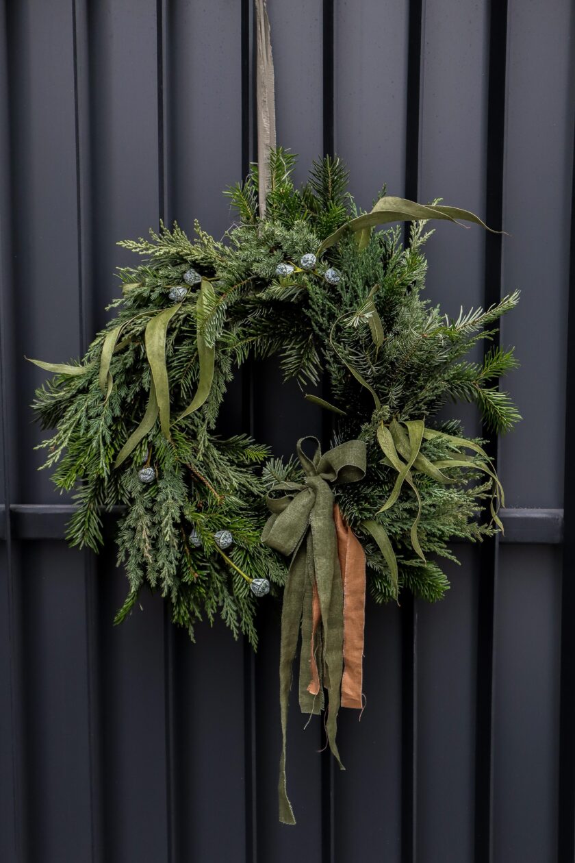O coroniță elegantă realizată manual din ramuri de ienupăr, eucalipt și brad, decorată cu o panglică fină în nuanțe de verde și maro. Verdele intens și textura naturală a ramurilor se îmbină armonios cu panglica delicată, creând un decor festiv rafinat, perfect pentru uși, mese sau colțuri speciale din casă.